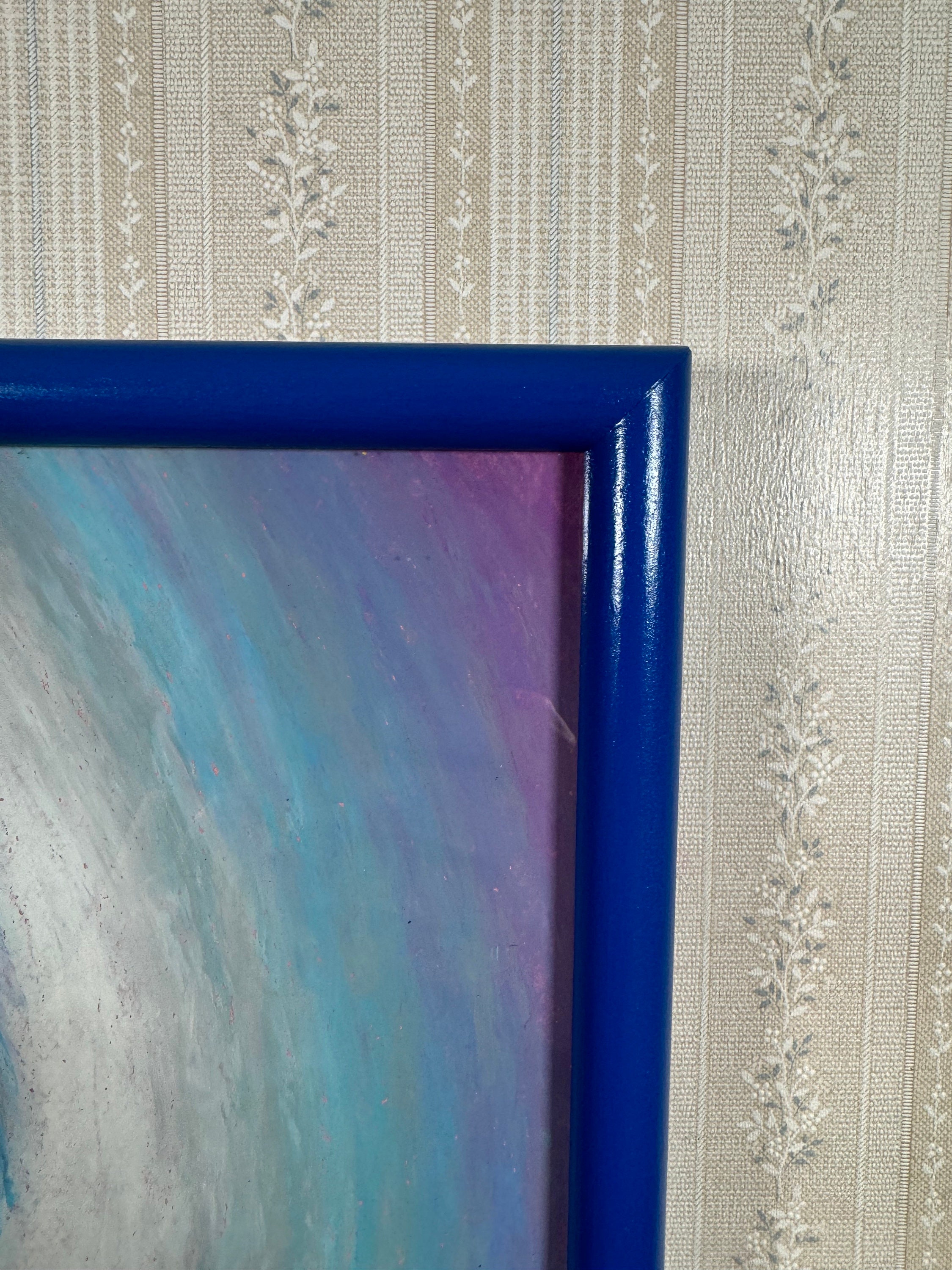 This 17” x 24” artwork comes professionally mounted, behind glass, in a frame hand-painted by artist. Total size of finished piece is 18” x 25” and comes complete and ready to hang!