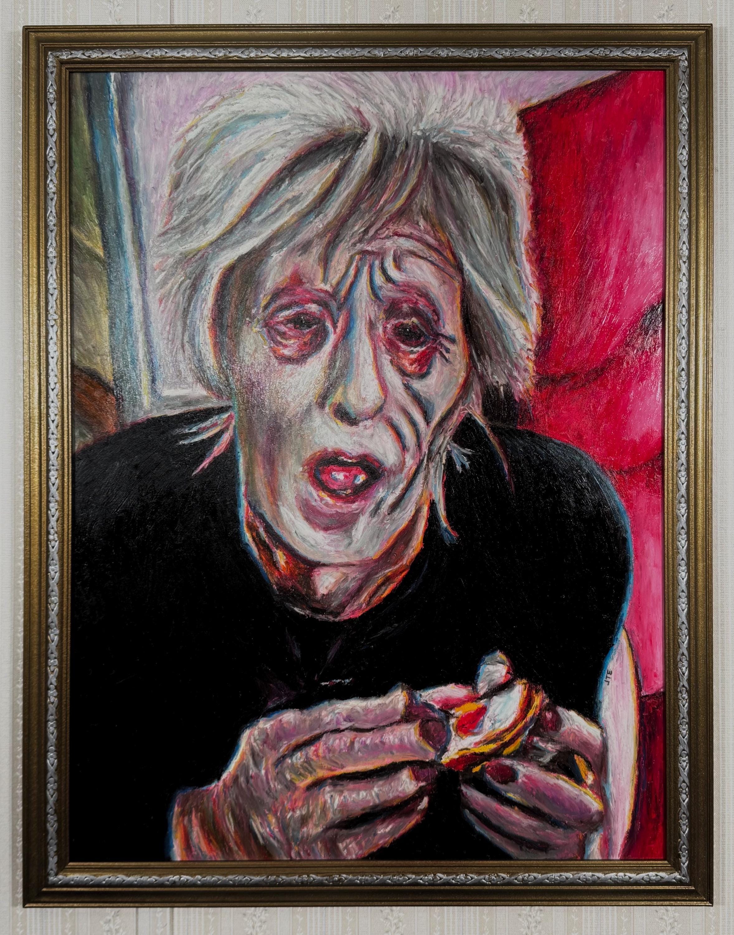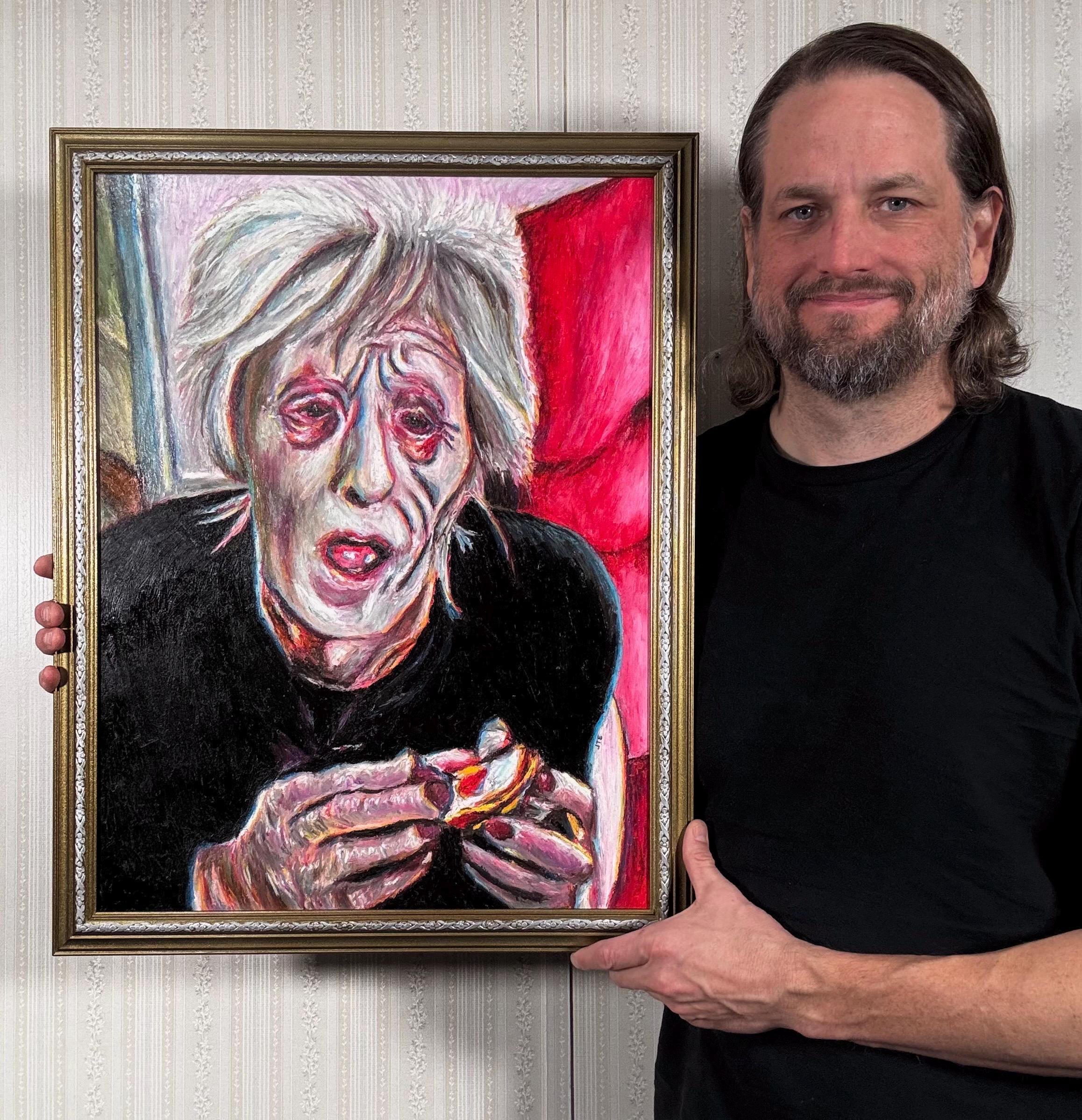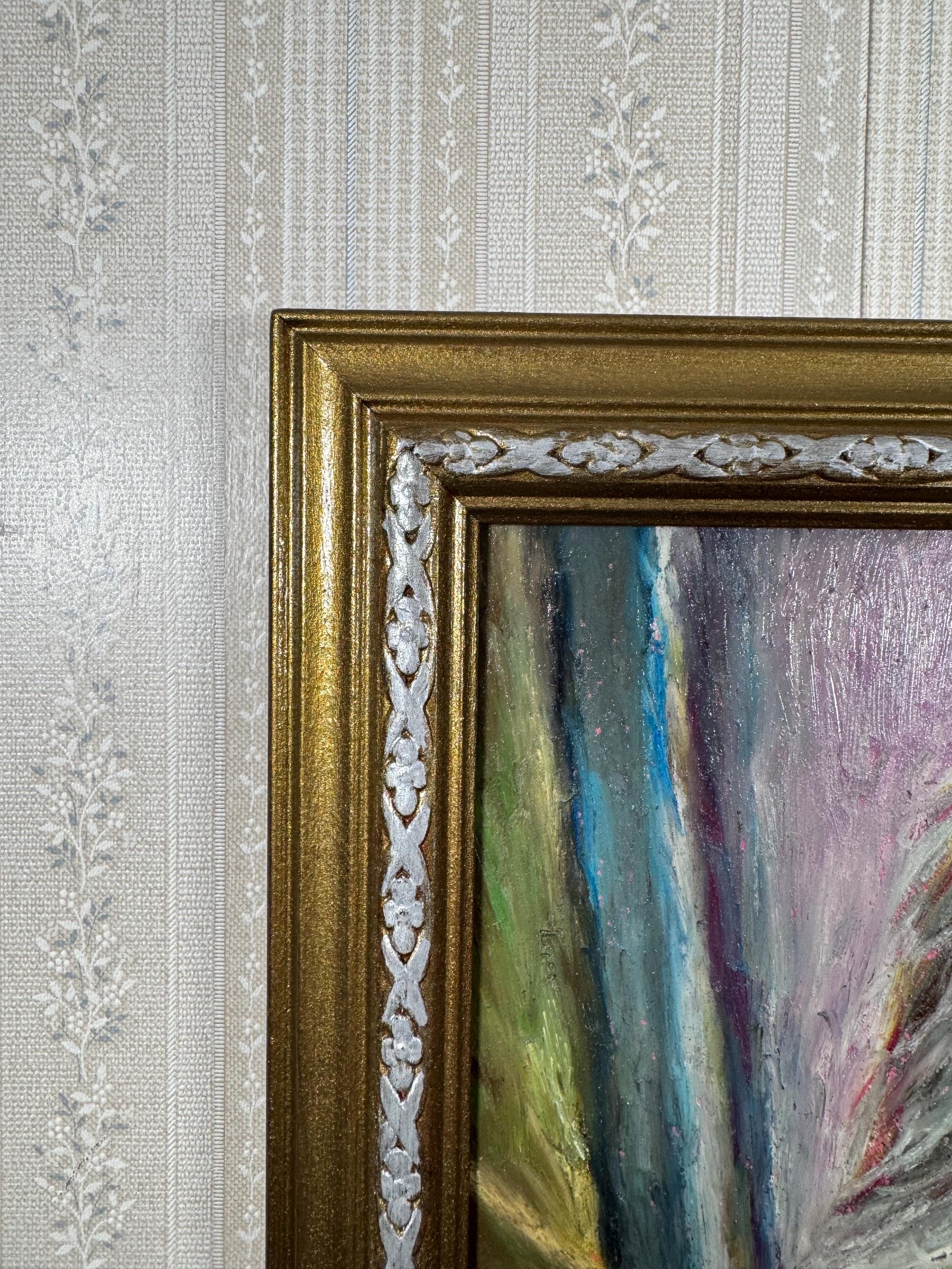 This 17 1/2” x 23” oil pastel artwork is on a birch wood panel, in a frame hand-painted by the artist. Total size of finished piece is 19 3/4” x 25 1/4” and comes complete and ready to hang!