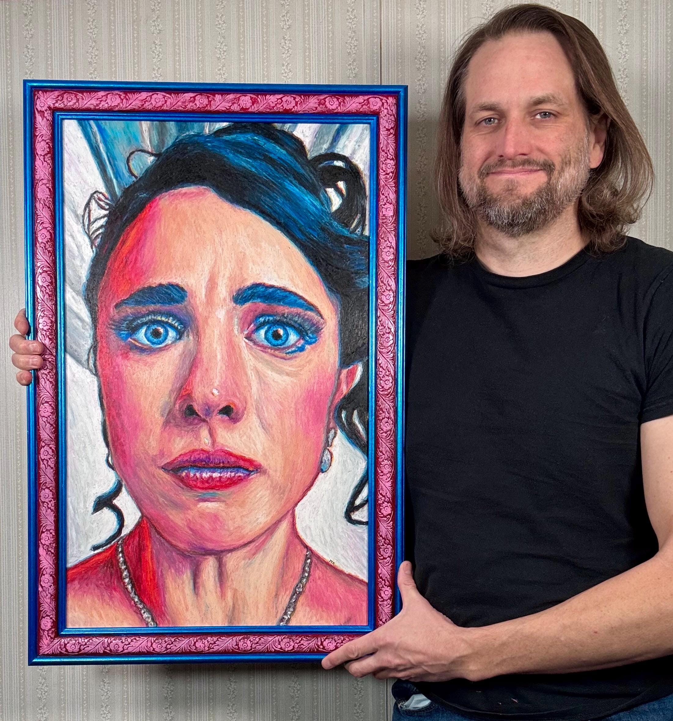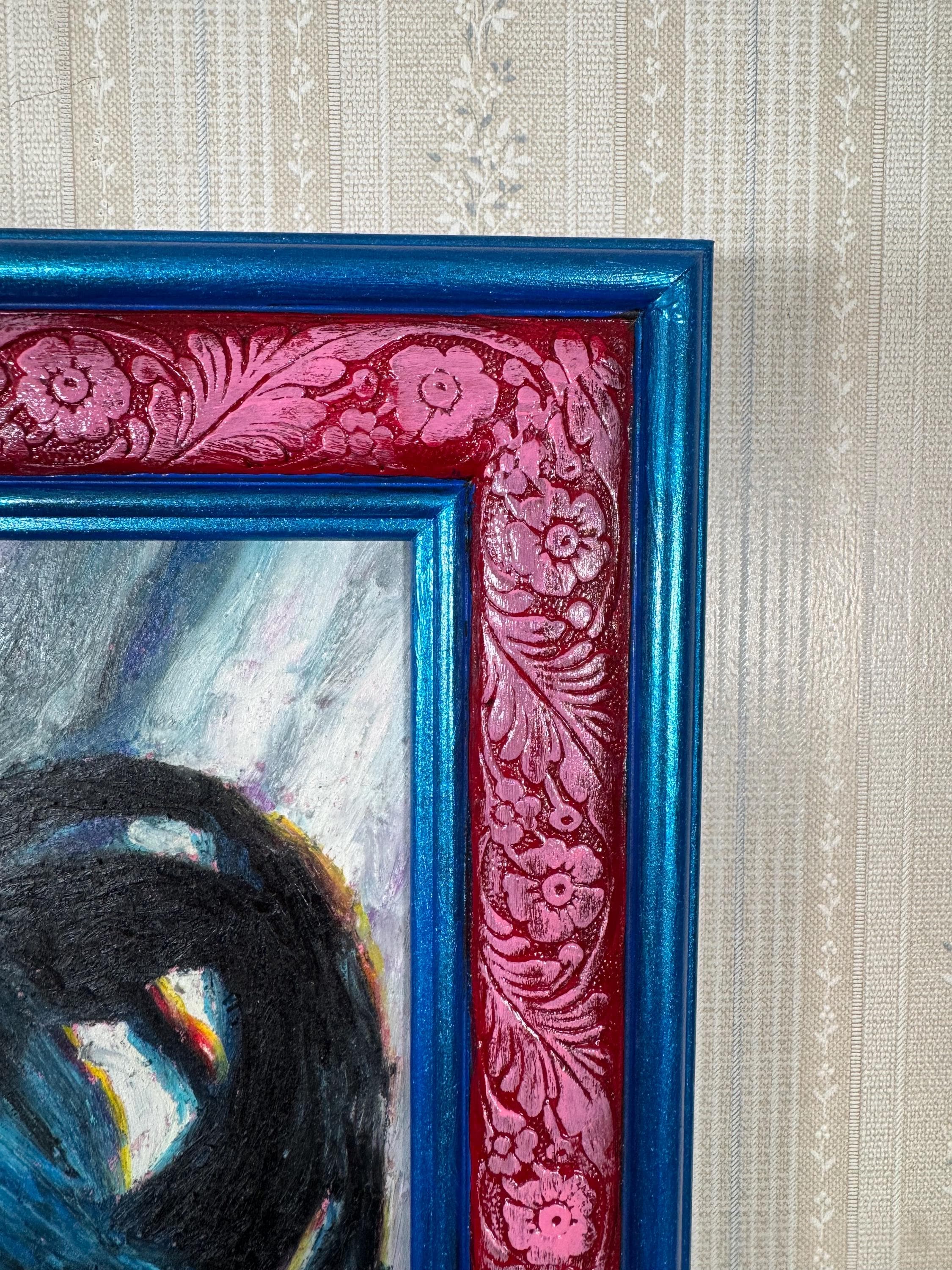 This 16 1/2” x 27” oil pastel artwork is on a birch wood panel, in a frame hand-painted by the artist. Total size of finished piece is 19 3/4” x 30 1/4” and comes complete and ready to hang!