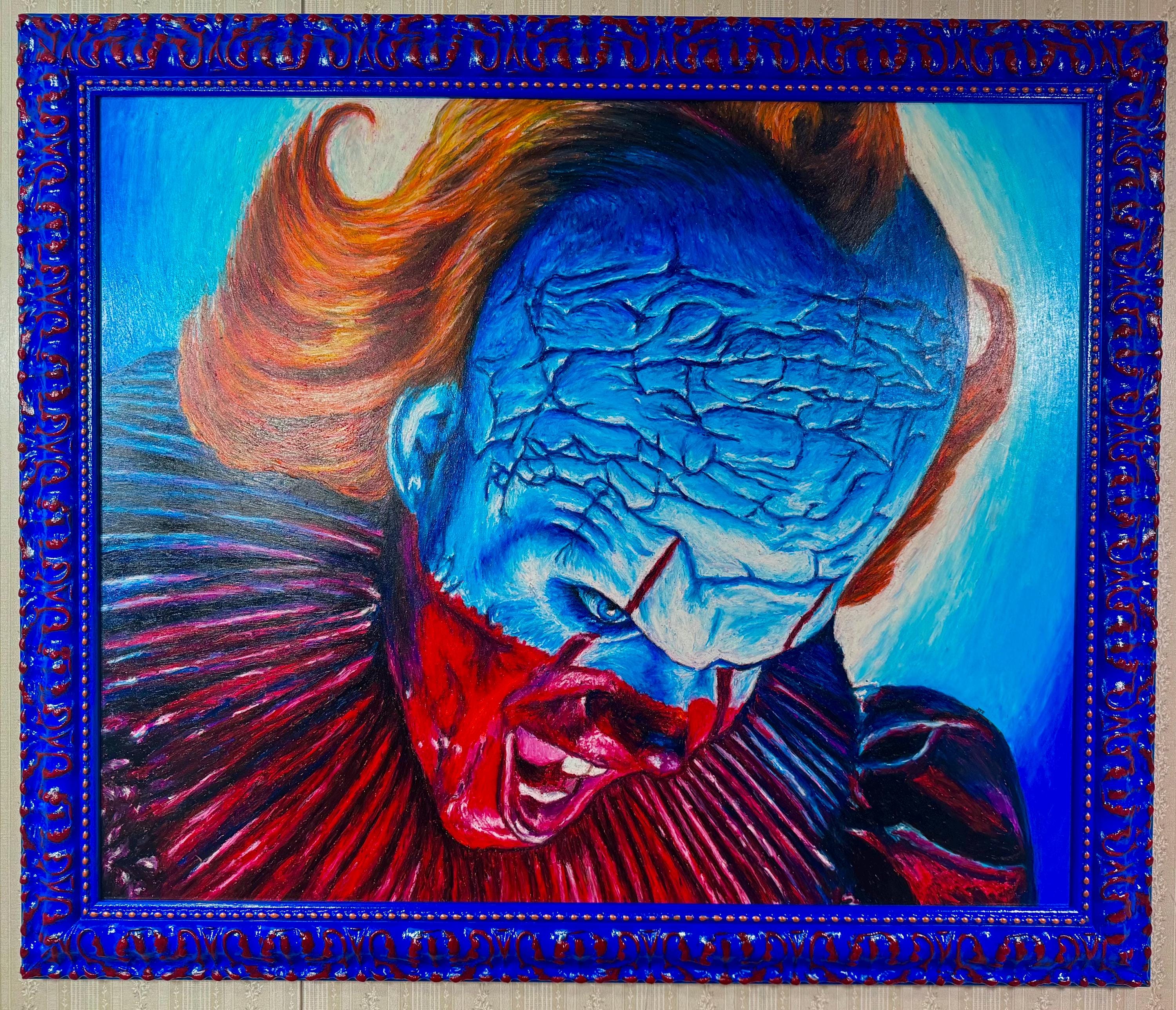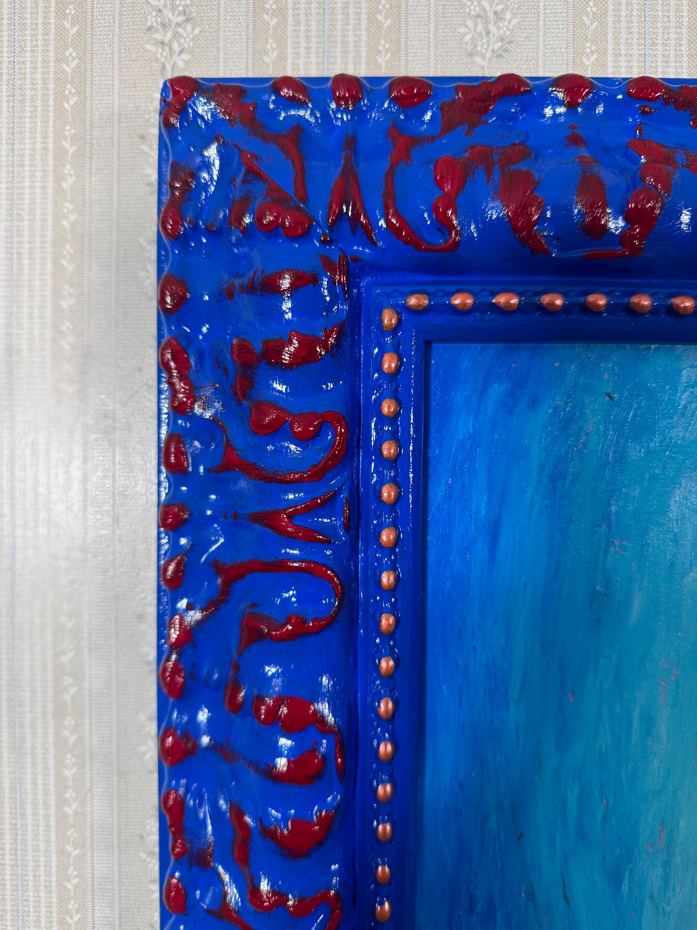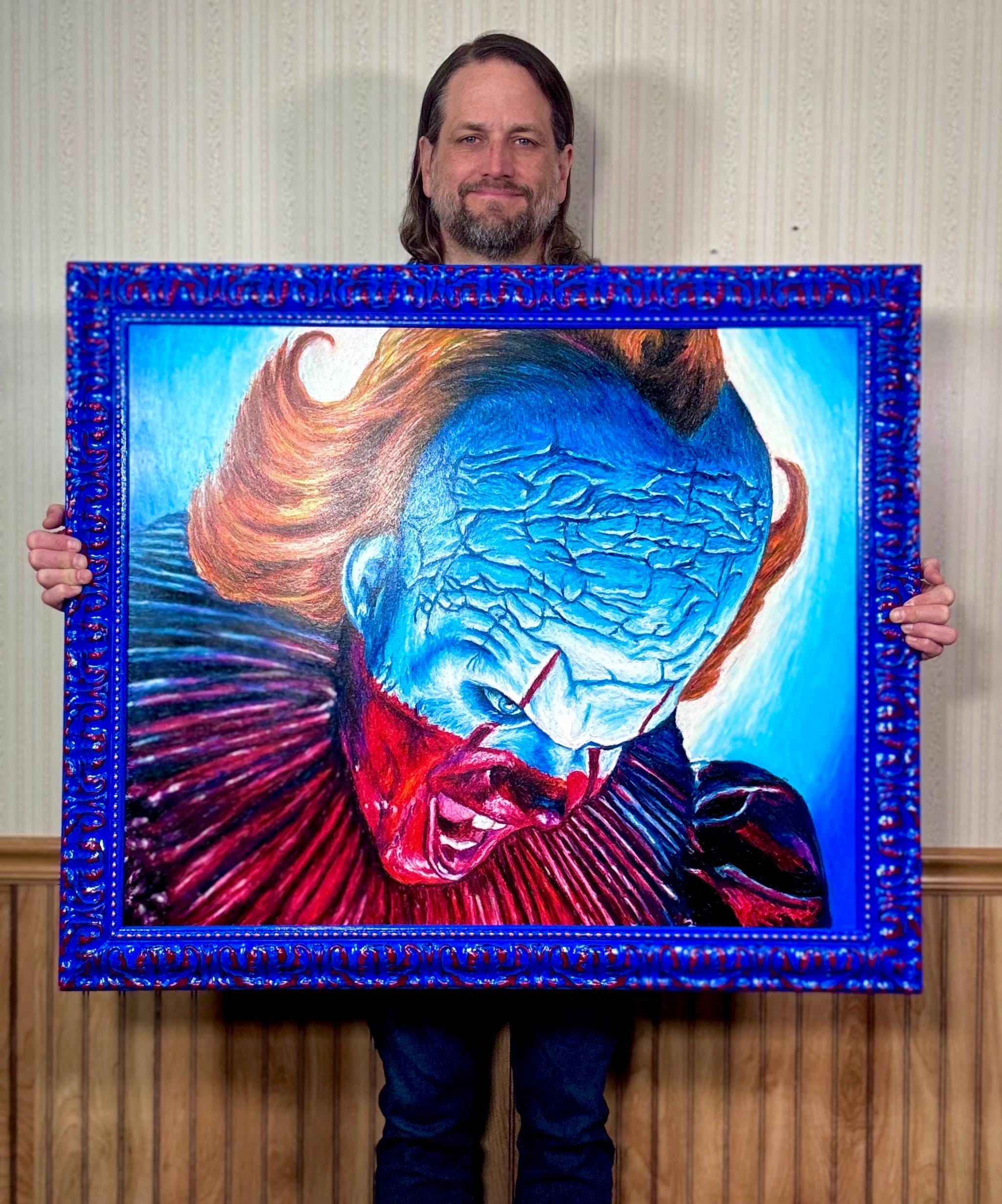 This 28” x 34” oil pastel artwork is on a birch wood panel, in a frame hand-painted by the artist. Total size of finished piece is 33 1/2” x 39 1/2” and comes complete and ready to hang!